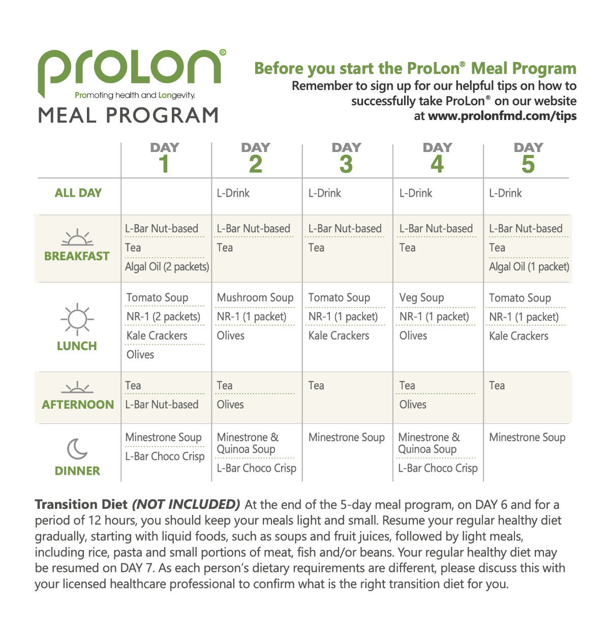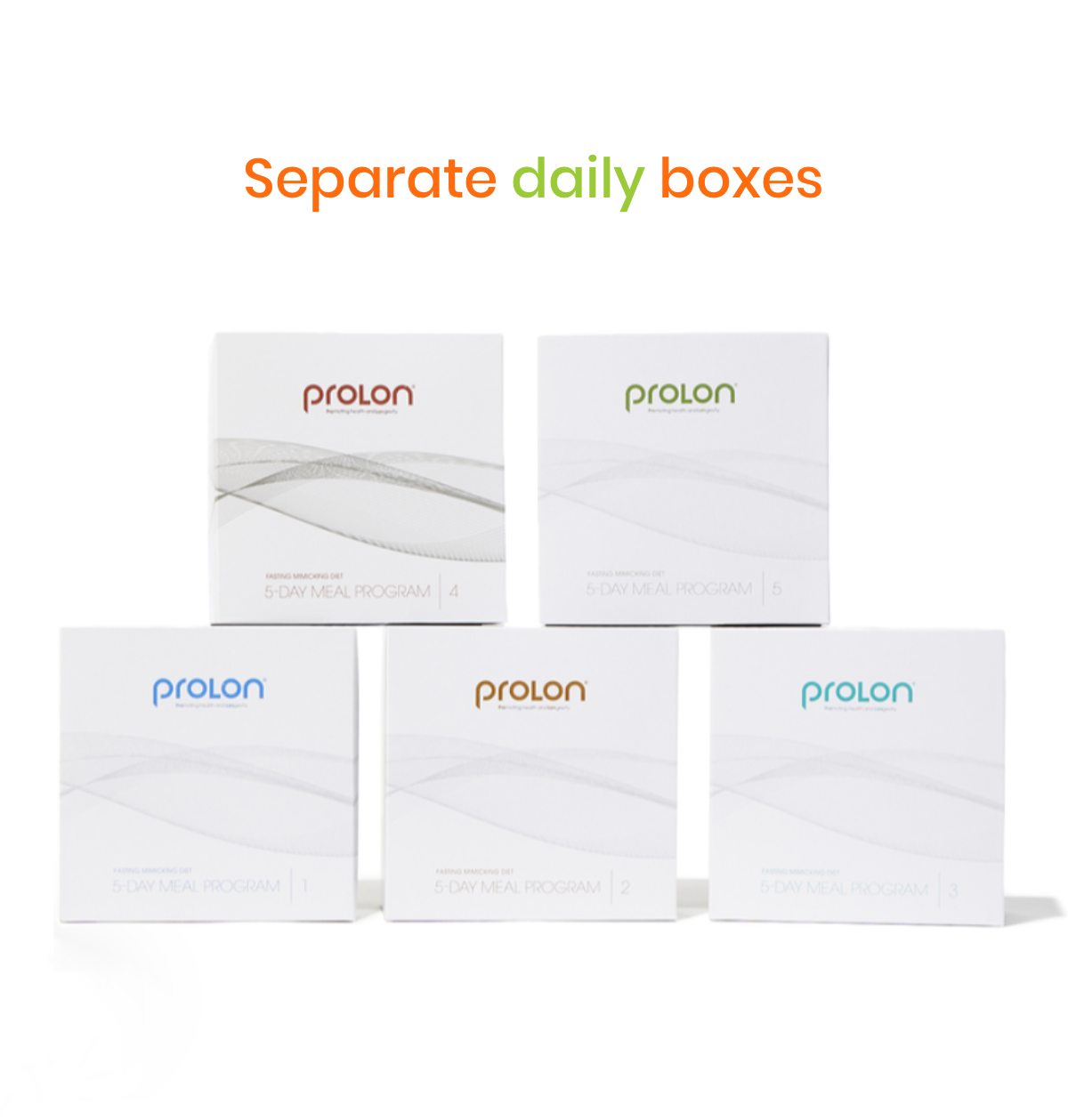With ProLon, you get everything you need pre-packaged and ready to go. Each kit comes with five boxes which are labeled by day so you know what to eat each day.